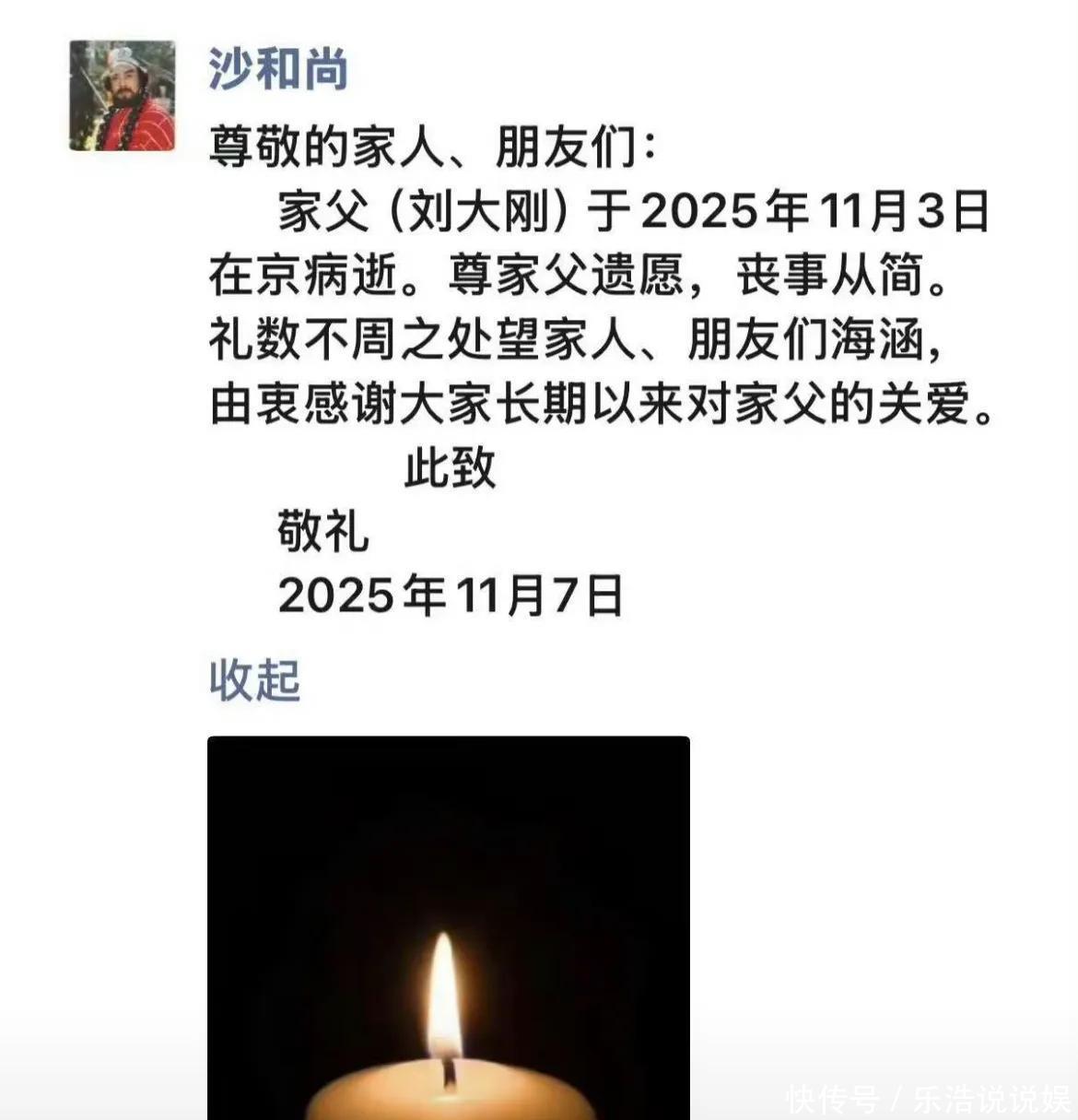 随后,刘冰也晒出了刘大刚老师家人发布的讣告,遵家父遗愿,一切从简。据悉:闫怀礼和刘大刚两位优秀的表演艺术家都曾在《西游记》系列中有惊艳的表现。2009年4月12日,86版《西游记》中沙僧的扮演者闫怀礼因病去世,享年73岁。
